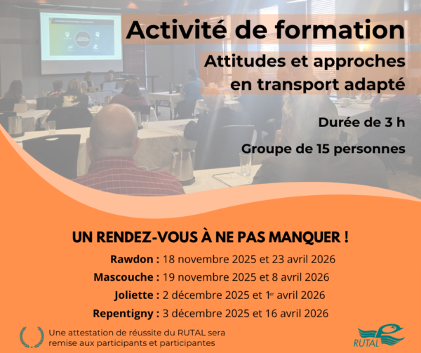 Bienvenue sur le formulaire d’inscription pour l’activité de formation « Attitudes et approches en transport adapté », destinée exclusivement aux associations membres du RUTAL.